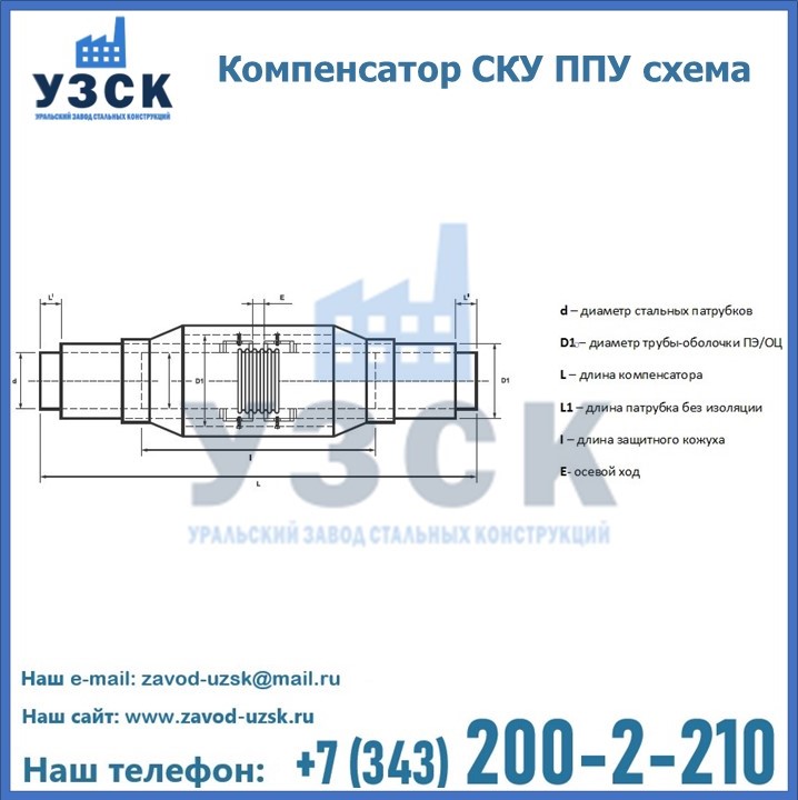 Уральский Завод Стальных Конструкций в Арысе предлагает готовые изделия, а также вы можете приобрести компенсатор СКУ ППУ под заказ. Наш завод располагает всем необходимым оборудованием для производства нестандартных позиций компенсатора СКУ в ППУ изоляции. Завод «УЗСК» предлагает большой выбор качественных и надежных компенсаторов СКУ ППУ, полностью укомплектованных и готовых к эксплуатации. Мы гарантируем соответствие нашей продукции всем требованиям ГОСТ и ТУ, износостойкость и высокую производительность. Наше предприятие поставляет и производит оборудование, имеющее длительную гарантию и большой эксплуатационный ресурс. Если вы хотите заказать сильфонные компенсационные устройства СКУ ППУ или другое оборудование с доставкой, наши специалисты помогут рассчитать стоимость транспортных расходов и организуют доставку товара. Вы можете оформить заказ на продукцию на нашем сайте, для этого достаточно заполнить форму обратной связи.